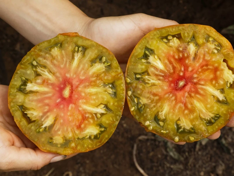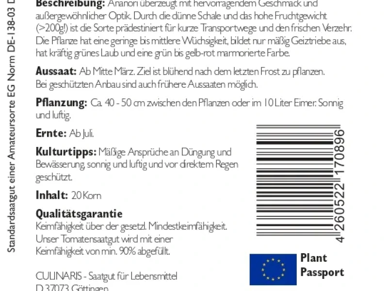 Ananori ist eine ältere Fleischtomate mit hervorragendem Geschmack und außergewöhnlicher Optik. Durch die dünne Schale und das hohe Fruchtgewicht (>200g!) ist die Sorte prädestiniert für kurze Transportwege und den frischen Verzehr. Die Pflanze hat eine geringe bis mittlere Wüchsigkeit, bildet nur mäßig Geiztriebe aus und hat kräftig grünes Laub. Die Früchte sind flachrund, leicht gerippt und haben je nach Reife und Anbaubedingungen eine grün bis gelb-rote marmorierte Farbe.