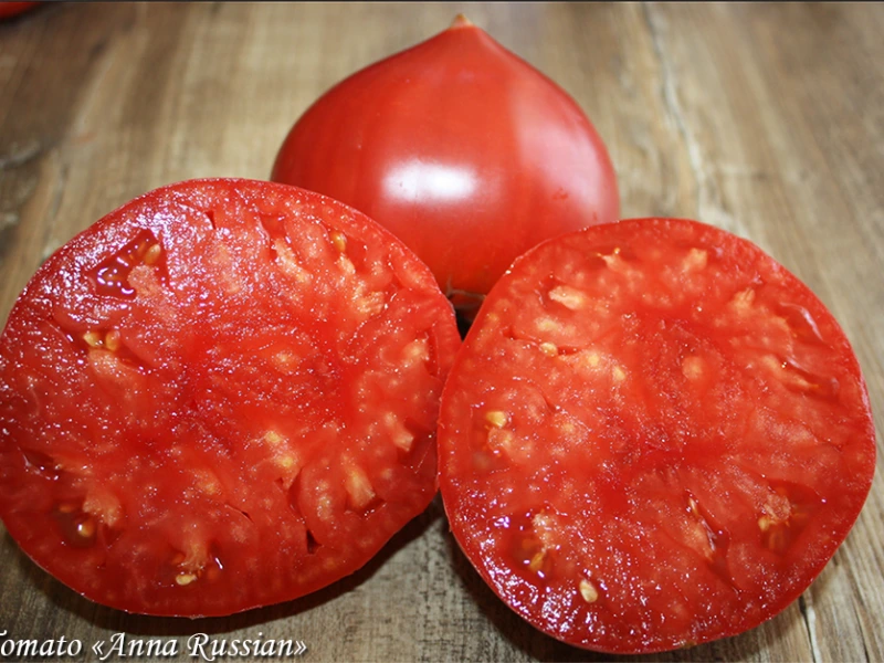 Anna Russian ist eine alte Tomatensorte, die an kühles Klima angepasst ist. Sie hat eine gute Wuchskraft, feines, herabhängendes Laub und produziert Rispen von 3 bis 4 großen rosaroten „Ochsenherz“-Früchten mit ausgezeichnetem Geschmack.