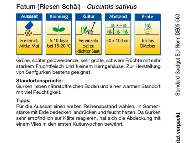 Für die Aussaat einen weiten Reihenabstand wählen, in Samenstärke mit Erde bedecken, andrücken und feucht halten. Da Gurken sehr empfindlich auf Kälte reagieren, hat sich die Abdeckung mit einem Vlies in den ersten Kulturwochen bewährt.