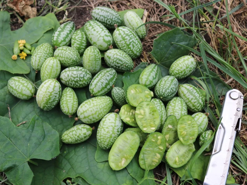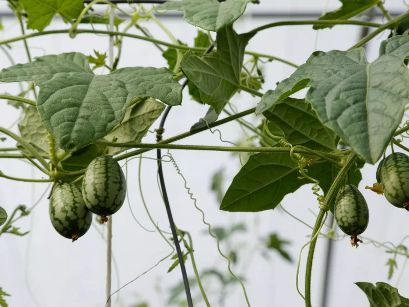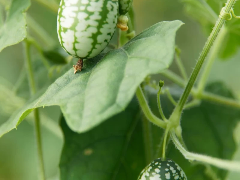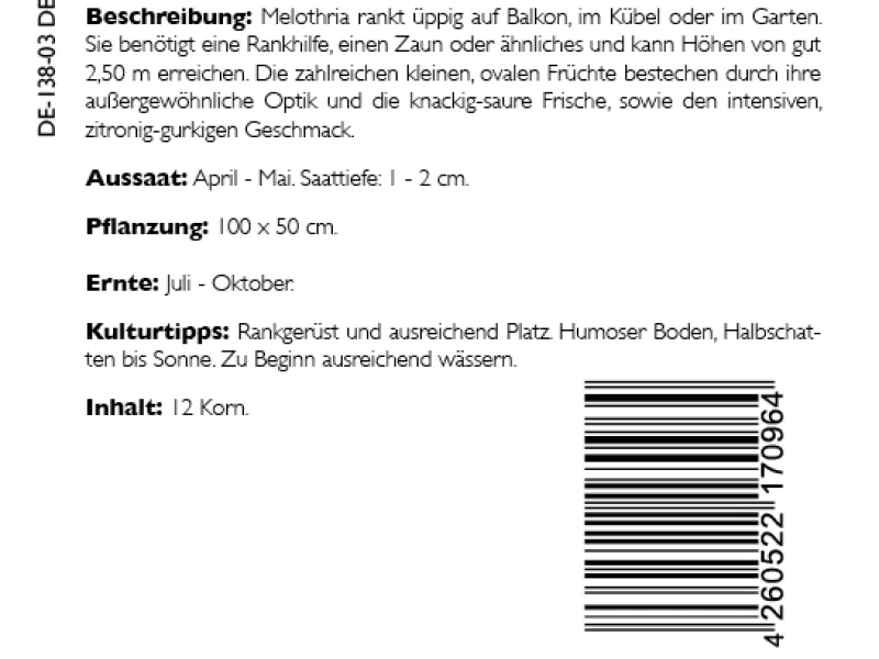 Melothria rankt üppig auf Balkon, im Kübel oder im Garten. Sie benötigt eine Rankhilfe, einen Zaun oder ähnliches und kann Höhen von gut 2,50 m erreichen. Die zahlreichen kleinen, ovalen Früchte bestechen durch ihre außergewöhnliche Optik und die knackig-saure Frische, sowie den intensiven, zitronig-gurkigen Geschmack.
