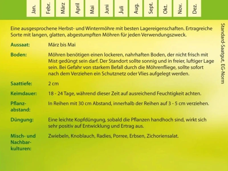 Eine ausgesprochene Herbst- und Wintermöhre mit besten Lagereigenschaften. Ertragreiche Sorte mit langen, glatten, abgestumpften Möhren für jeden Verwendungszweck.