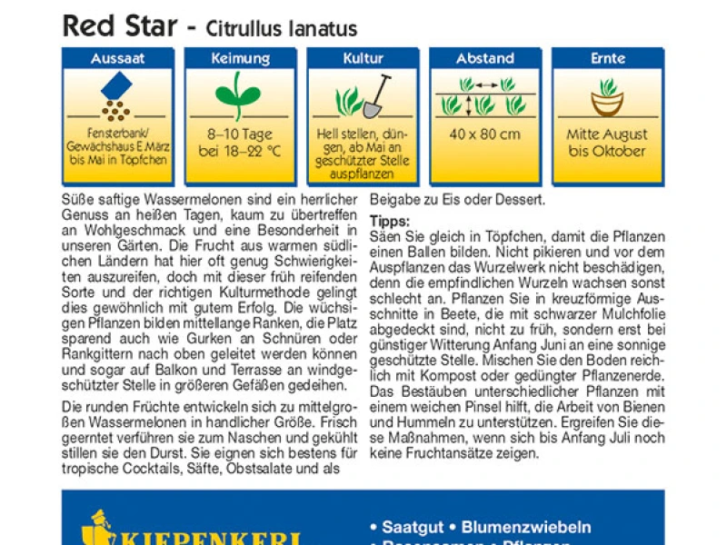 Süße saftige Wassermelonen sind ein herrlicher Genuss an heißen Tagen, kaum zu übertreffen an Wohlgeschmack und eine Besonderheit in unseren Gärten. Die Frucht aus warmen südlichen Ländern hat hier oft genug Schwierigkeiten auszureifen, doch mit dieser früh reifenden Sorte und der richtigen Kulturmethode gelingt dies gewöhnlich mit gutem Erfolg. Die wüchsigen Pflanzen bilden mittellange Ranken, die Platzsparend auch wie Gurken an Schnüren oder Rankgittern nach oben geleitet werden können und sogar auf Balkon und Terrasse an windgeschützter Stelle in größeren Gefäßen gedeihen. Die runden Früchte entwickeln sich zu mittelgroßen Wassermelonen in handlicher Größe. Frisch